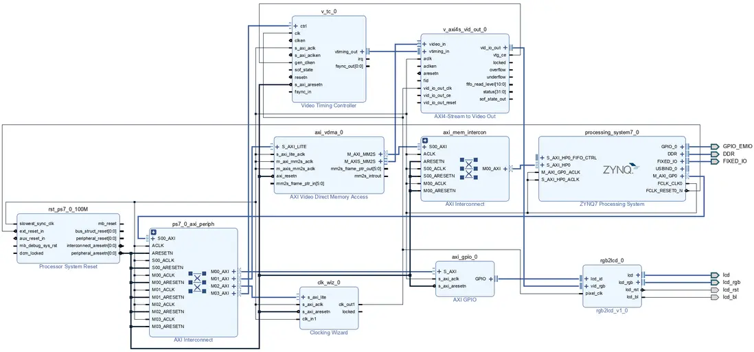 本次實驗需要完成RGB LCD屏顯示GUI界面,並且支持觸摸的功能,顯示的功能可以由VDMA IP核、Video Timing Controller IP核、AXI-Stream to Video Out IP核、rgb2lcd IP核實現;觸摸功能由EMIO模擬IIC接口實現。所以本次Block Design工程實際上和《領航者嵌入式Vitis開發指南》中的“RGB LCD畫板實驗”完全一致,可以直接在此工程基礎上,另存為本次實驗的工程即可,本次工程命名為“zynq_lvgl”。
