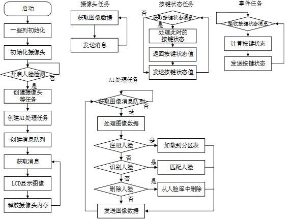 在上述函數中,我們創建了四個消息隊列以遞交消息,並設置了一個互斥鎖來防止任務優先級翻轉。此外,還定義了五個任務:檢測KEY按鍵狀態(用於判斷按鍵處於哪種狀態,如長按、點擊和雙擊等)、事件任務、攝像頭獲取任務、AI處理任務和按鍵掃描任務任務。