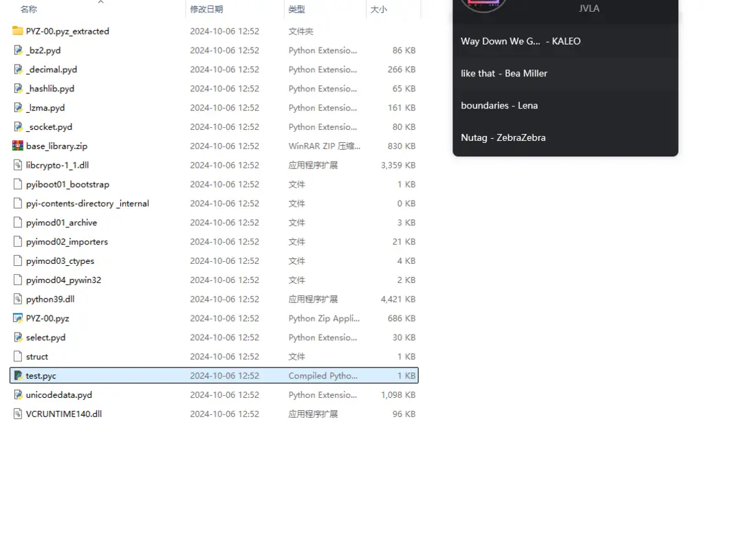 5. 進入該文件,將 test(取決於可執行程序名)文件修改成.pyc文件