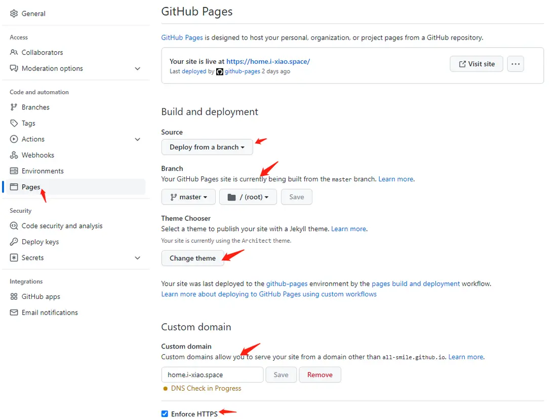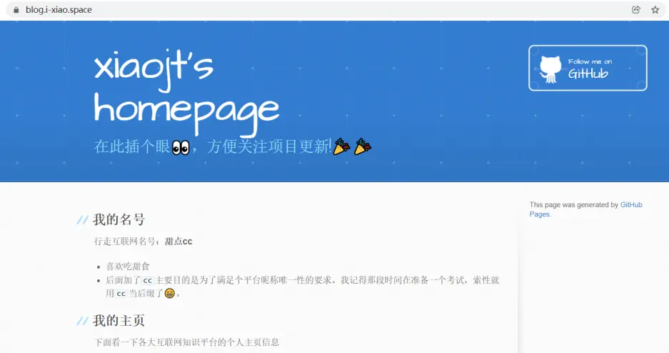 🔊 此時站點已經建成,可以訪問 https://<username>.github.io/ 查看,如果已經有個人域名了,也可以綁定個人域名,繼續往下看👇