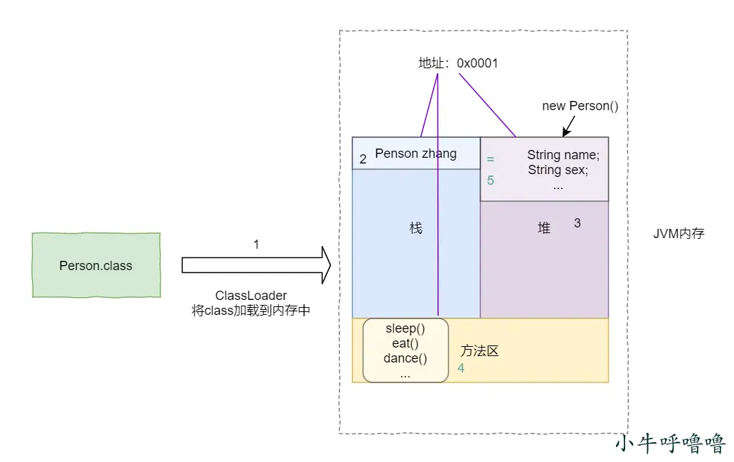 - 執行main方法時,在棧內存中開闢了main方法的空間(壓棧-進棧),然後在main方法的棧區分配了一個變量zhang。