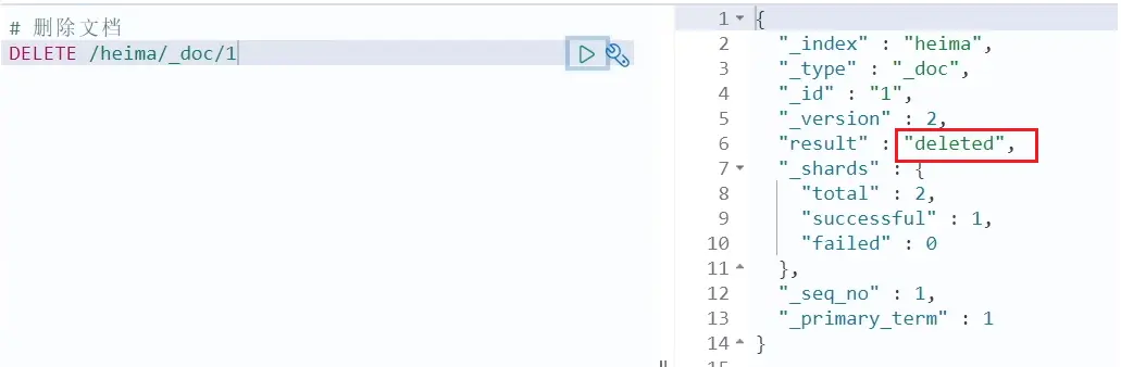 - 刪除文檔:DELETE /{索引庫名}/_doc/文檔id