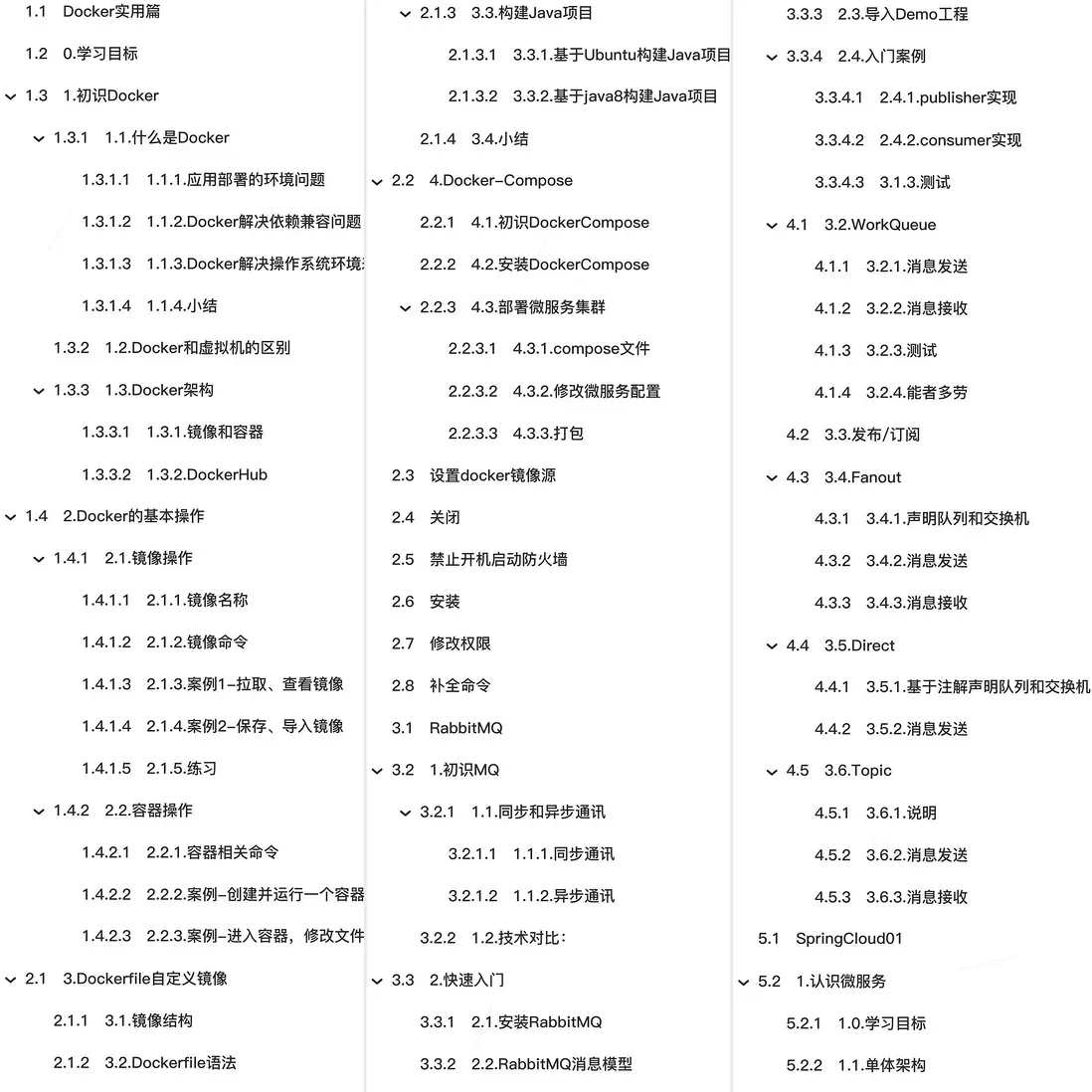 🏆🏆🏆教程全知識點簡介:Docker實用篇 0.學習目標 1.初識Docker 1.2.Docker和虛擬機的區別 2.Docker的基本操作 2.1.鏡像操作 2.1.3.案例1-拉取、查看鏡像 2.1.5.練習 3.Dockerfile自定義鏡像 3.3.構建Java項目 3.4.小結 4.Docker-Compose 4.3.部署微服務集羣 4.3.1.compose文件 4.3.3.打包 設置docker鏡像源 關閉 禁止開機啓動防火牆 安裝 修改權限 補全命令 RabbitMQ 1.初識MQ 1.1.同步和異步通訊 1.2.技術對比: 2.快速入門 2.2.RabbitMQ消息模型 2.3.導入Demo工程 2.4.入門案例 2.4.1.publisher實現 3.1.3.測試 3.2.WorkQueue 3.2.1.消息發送 3.2.4.能者多勞 3.3.發佈/訂閲 3.4.Fanout 3.4.1.聲明隊列和交換機 3.5.Direct 3.6.Topic 3.6.1.説明 SpringCloud01 1.認識微服務 1.1.單體架構 2.服務拆分和遠程調用 2.1.服務拆分原則 2.3.實現遠程調用案例 2.3.1.案例需求: 2.3.2.註冊RestTemplate 3)啓動多個user-service實 4.Ribbon負載均衡 4.1.負載均衡原理 4.2.源碼跟蹤 1)LoadBalancerIntercepor 3)負載均衡策略IRule 5.Nacos註冊中心 5.1.認識和安裝Nacos 5.2.服務註冊到nacos 1)引入依賴 2)配置nacos地址 3)重啓 5.3.服務分級存儲模型 5.3.2.同集羣優先的負載均衡 5.4.權重配置 Nacos安裝指南 1.Windows安裝 1.1.下載安裝包 1.2.解壓 1.3.端口配置 1.4.啓動 1.5.訪問 2.Linux安裝 2.1.安裝JDK 3.Gateway服務網關 3.1.為什麼需要網關 3.3.斷言工廠