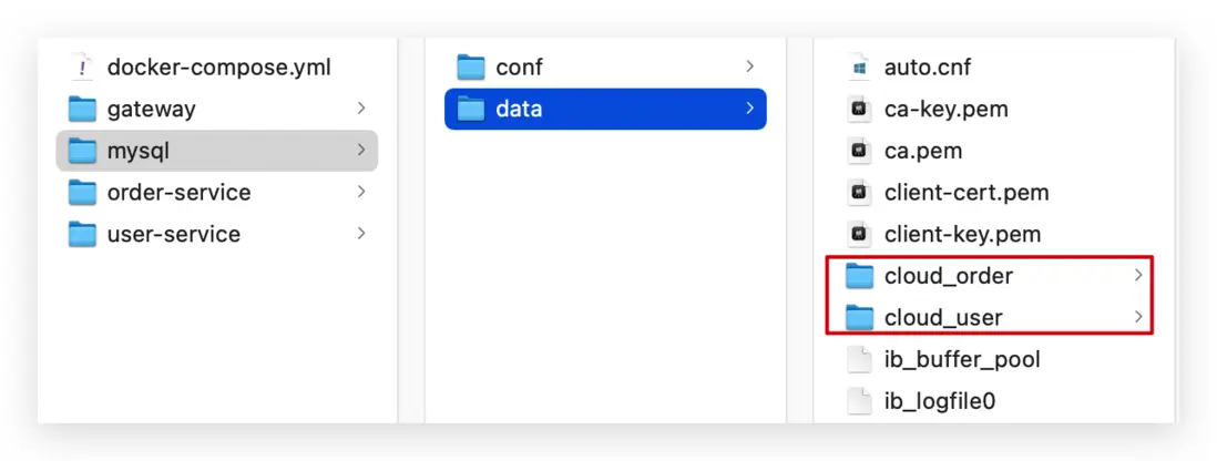 查看mysql目錄,可以看到其中已經準備好了cloud_order、cloud_user表: