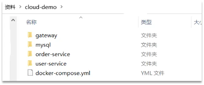 查看課前資料提供的cloud-demo文件夾,裏面已經編寫好了docker-compose文件,而且每個微服務都準備了一個獨立的目錄: