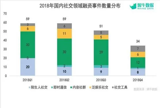 • 而在2018年社交的各個細分領域下,均有備受資本所關注的項目,根據烯牛數據2018年的報告中,也同樣指出:內容社交及陌生人社交為資本重要關注領域,合計融資佔比達73%。