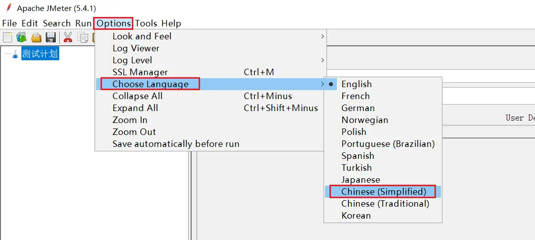 默認Jmeter的語言是英文,需要設置: