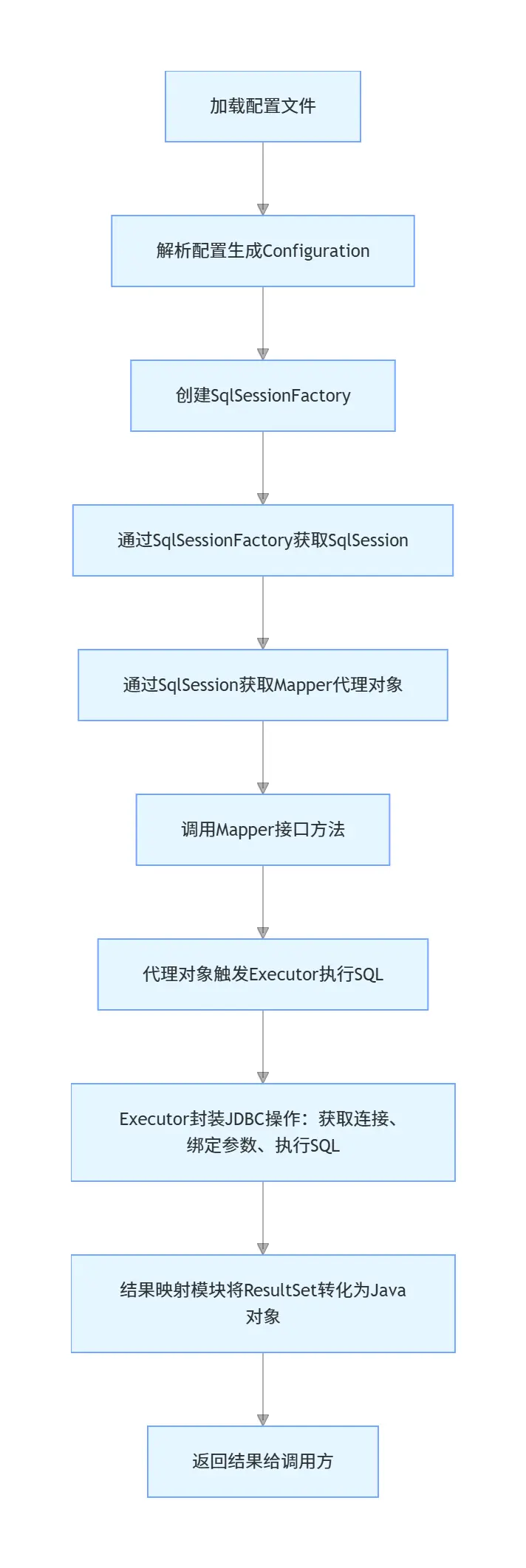 - 答:加載配置文件→解析生成Configuration→創建SqlSessionFactory→獲取SqlSession→獲取Mapper代理對象→調用接口方法→代理對象攔截並獲取MapperStatement→Executor執行SQL(獲取連接、綁定參數、執行SQL)→結果映射→返回結果。