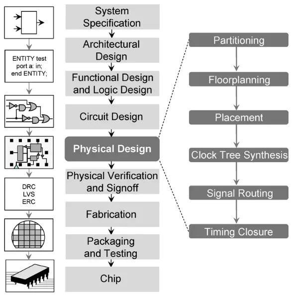 下圖為典型的物理設計流程圖,從系統規格、功能邏輯設計,一直到最終佈局和驗證階段,一目瞭然地展現了每一步的重要作用及銜接關係。此圖生動演示流程的清晰結構,便於快速理解物理實現的全景。