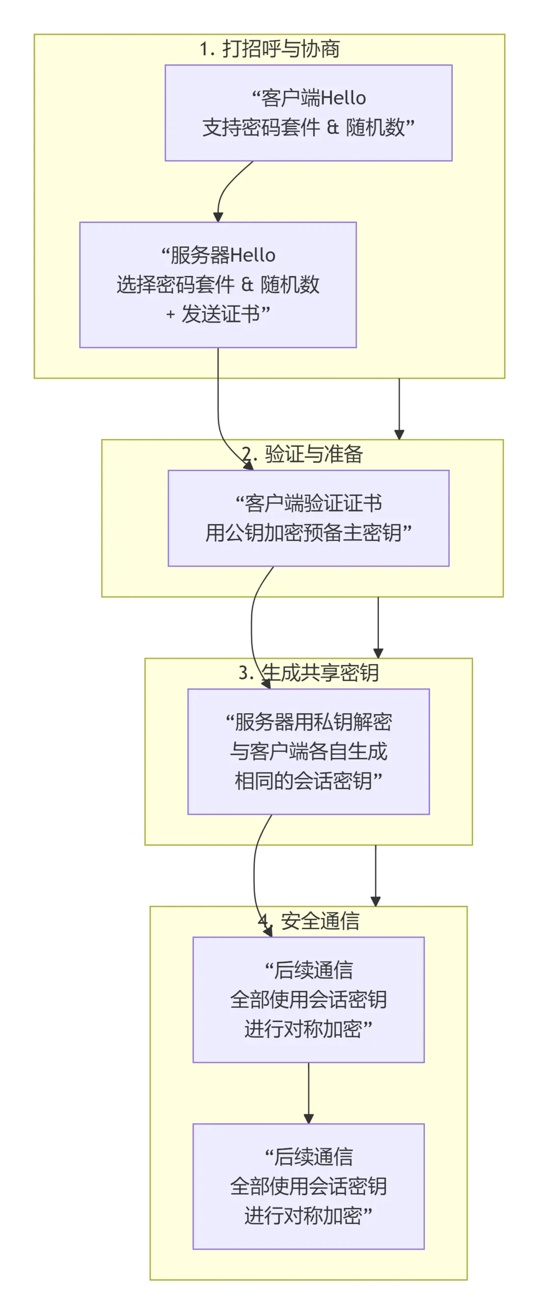 整個握手過程可以清晰地分為四個階段,其核心目標是安全地協商出一把只有通信雙方知道的“會話密鑰”,用於後續的加密通信。