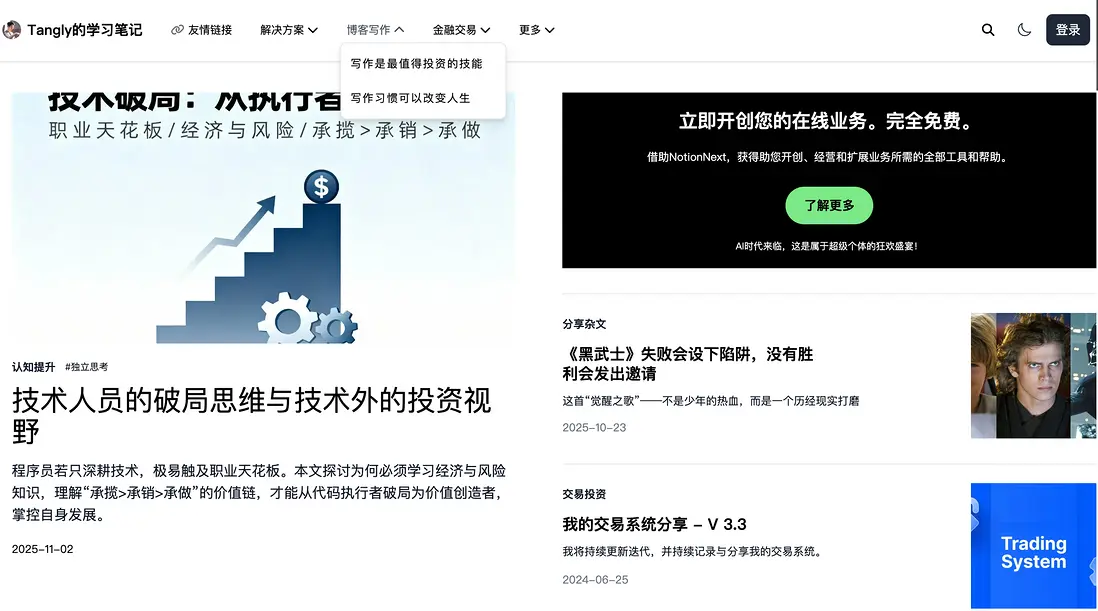 NotionNext是作者tangly1024在Github上開源的基於Next.js框架開發的博客生成器。目的是幫助寫作愛好者們通過Notion筆記快速搭建一個獨立站,從而專注於寫作、而不需要操心網站的維護。