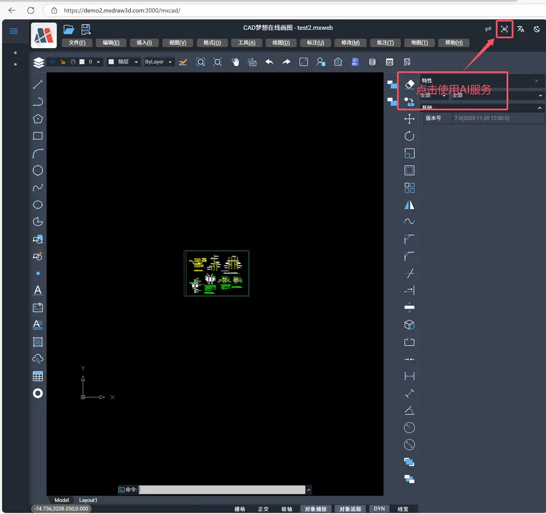 首先打開https://demo2.mxdraw3d.com:3000/mxcad/,如下圖:
