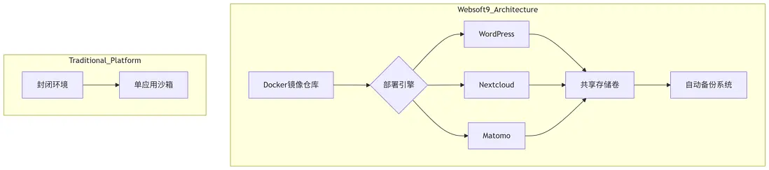 | 支持系統 | ✅ 300+ 應用 | ❌ 僅限單一建站系統 | W9實現跨類型應用混合部署(如網站+數據分析+雲盤),傳統平台只能建站 |