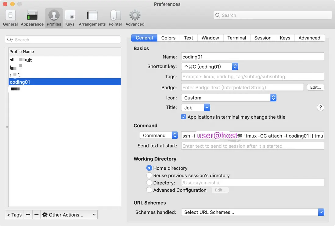 然後,我們在 iterm2 增加一個「Profile」,在「General」加入 「Command」命令: