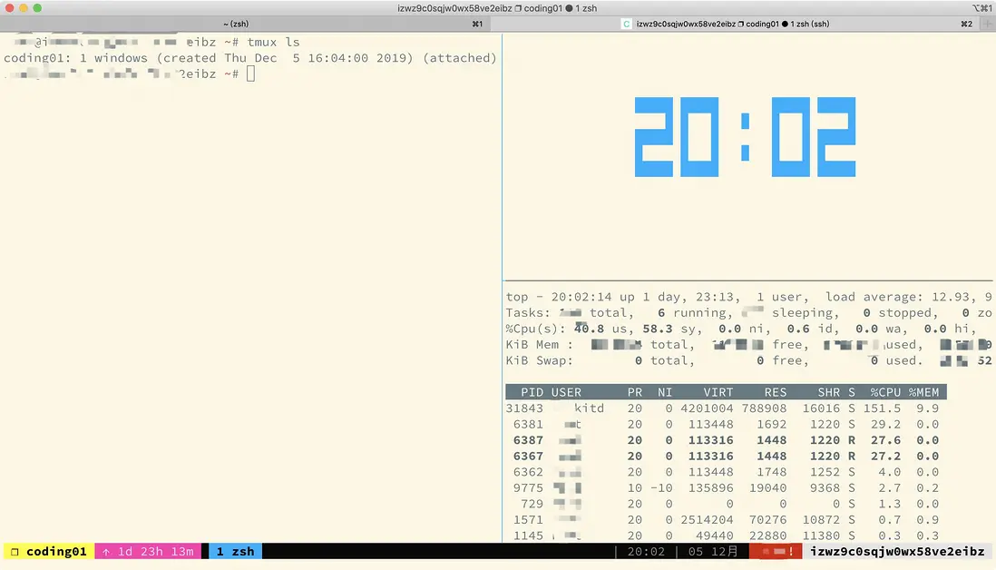 最後來看看我 tmux 面板,我喜歡分成三個 pane,左邊用於常規使用,右上角可以放一些實時性或者有意思的操作 (比如:顯示⏲️);右下角執行 top 命令可以時刻關注服務器運行情況。
