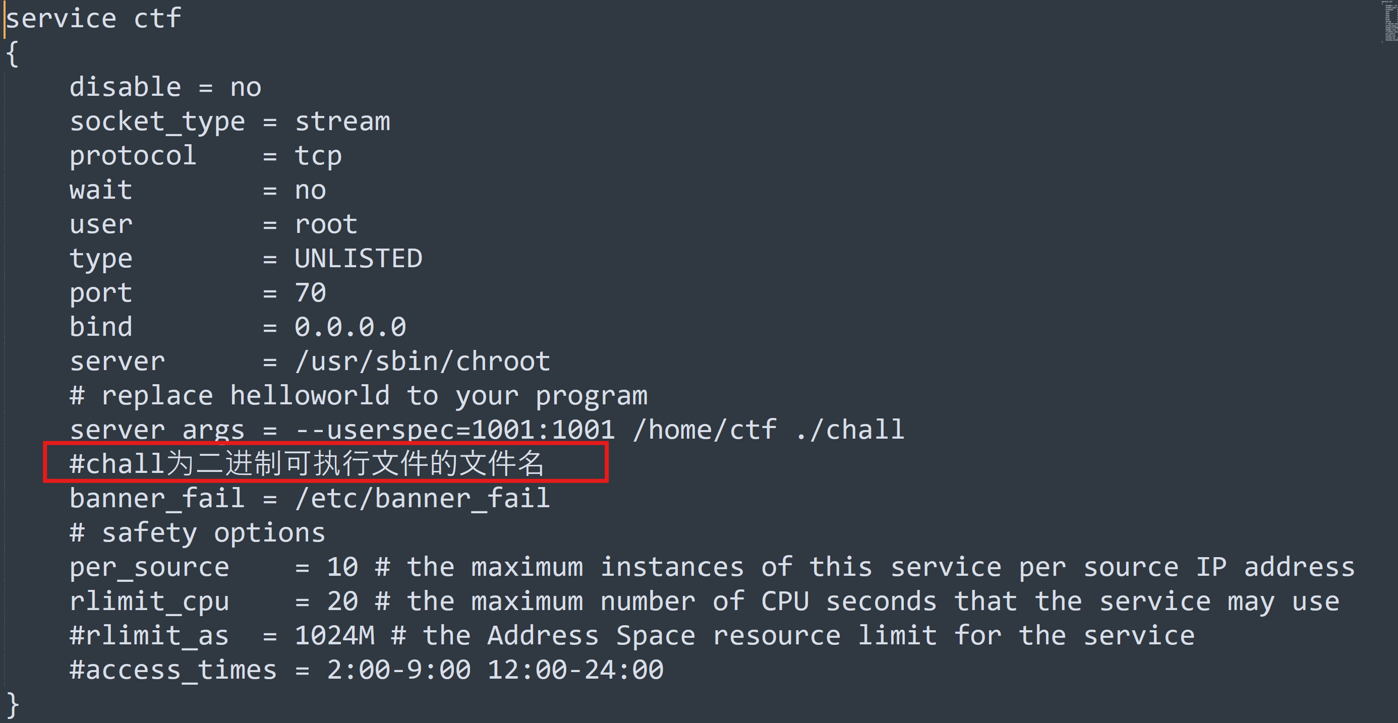 下載題目給的附件,查看文件ctf.xinetd之後,知道我們的可執行程序名為chall: