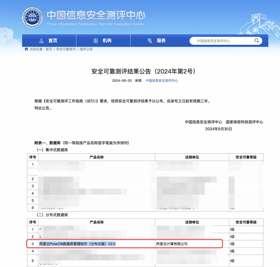 PolarDB 數據庫管理軟件(分佈式版)V2.0 於2024年9⽉通過數據庫安全可靠測評,測評結果公示