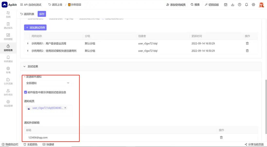 例如:下圖的設置,表示每週日至週三,在演示環境中測試自動化測試示例-1、自動化測試示例-2,並且將錯誤報告發送給123456@qq.com郵箱中。