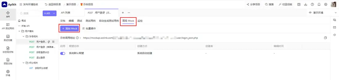 功能入口:API管理應用 / 選中某個項目 / API文檔菜單 / 選中某一API文檔 / 點擊“高級Mock”TAB