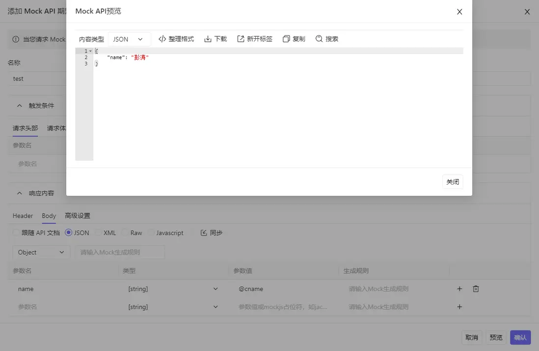 簡易Mock功能可在編寫API文檔的時候,同時對不同的返回結果進行Mock配置。並且可預置智能Mock規則,在編寫返回參數時,若參數名和字段類型匹配智能Mock規則時,系統自動填入該參數的Mock規則。