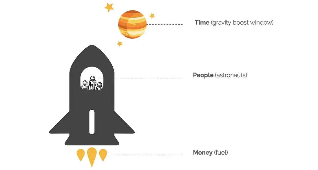火箭飛船能夠行駛多遠取決於所攜帶的燃料、機組人員的素質以及利用其他天體(如木星)的引力助推的能力這一受時間限制的因素。同樣,產品團隊發佈產品的時候,也會受到 資金、人員和時間 限制。產品團隊的任何一次任務都會受到這三方面因素的限制。