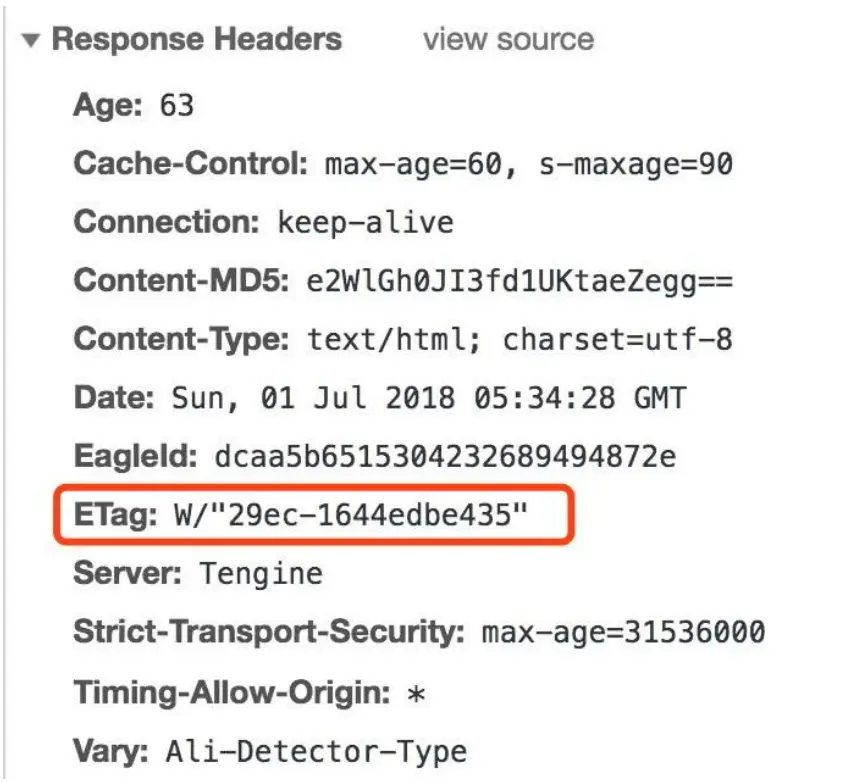 當瀏覽器第二次發送請求時,會在請求頭的 If-None-Match 字段加上上次請求返回的 ETag 標識。HTTP 服務器收到該標識後,會對該資源的標識進行對比,如一致,則證明該資源無更新,然後響應 304 告訴客户端可直接使用瀏覽器資源副本。若不一致,服務器則響應 200,並向客户端發送新的資源。