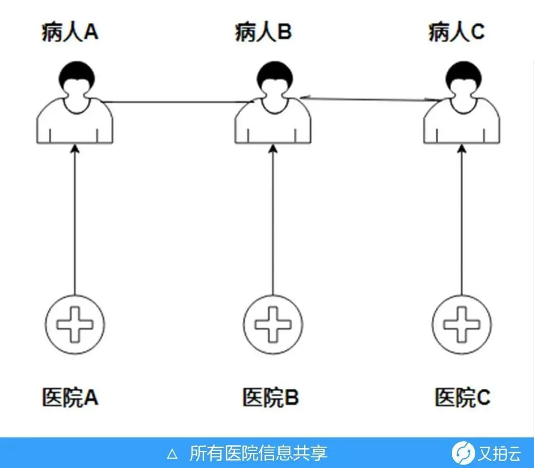 那麼,如果每家醫院的病人信息在所有醫院都能看到,以後看病是不是就會既省錢又高效了?也就是説,每個醫院都把病人信息上傳到一個地方,然後所有醫院的信息,打包成塊連接起來。與此同時,每家醫院還會生成一個副本,備份着所有醫院的數據。這樣,一家醫院就可以看到所有醫院上傳的病人信息。二狗子再去另一家醫院看病,醫生只需要調出之前醫院檢查的信息,也就不用再做重複的檢查了。