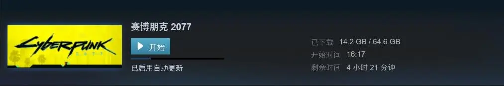 《賽博朋克 2077》連補丁在內一共 65G,可以説是近一段時間內二狗子下載的最大的遊戲了,不過好在 Steam 的下載速度還是一如既往的給力,只需要 4 個多小時的等待就可以開始夜之城之旅。