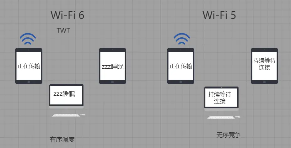 上一代 Wi-Fi 基本工作模式是這樣的:當一個終端與路由器正在進行數據傳輸時,其他設備則在無序的持續等待接收數據。而 Wi-Fi 6 使用全新 TWT 技術,當一個設備進行數據傳輸時,其他設備處於連接休眠狀態,很好地提升了終端設備的電池壽命。