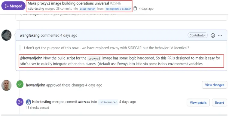 就第一個問題,我們向 Istio 社區貢獻 PR,幫助 Istio 數據面和控制面的鏡像構建實現解耦,使其更容易集成第三方的數據面。而在 7 月 14 號 Istio TOC(Istio 技術委員會)成員 @Shriram Rajagopalan 也回覆我們“也是支持 Istio 中支持多數據面的方案,而且也建議先把 MOSN 做為實驗性第三方數據平面納入到 Istio 的官方博客中,方便用户來試用”,這説明 MOSN 已經充分得到 Istio 官方認可。