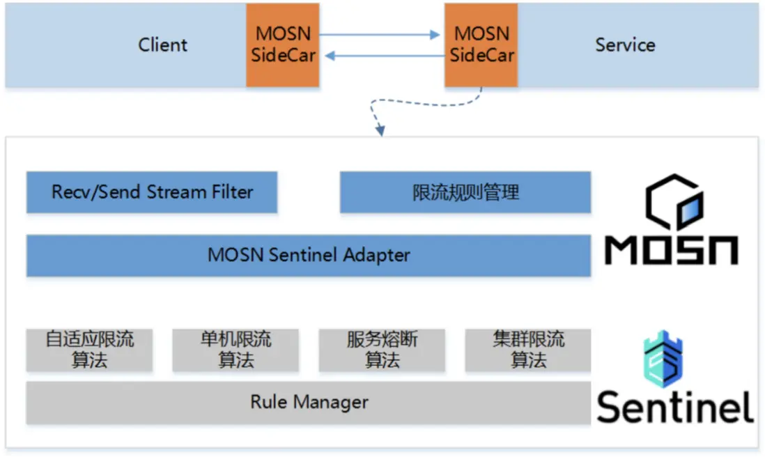 限流是服務治理中重要功能之一,而 Sentinel 是阿里巴巴開源的限流組件,經歷過雙十一大促考驗,所以我們選擇通過 MOSN 集成 Sentinel 複用其底層的限流能力,實現單機限流(令牌桶/漏桶結合)、服務熔斷保護(服務成功率)、自適應限流(依據機器負載)等功能。下一步我們將豐富限流算法,結合 Istio 聯手 UDPA 制定新規則。