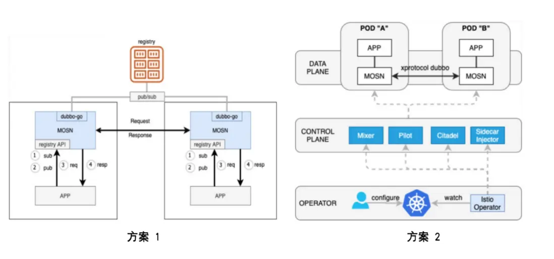 MOSN 可以解決 Kubernetes 體系和非 Kubernetes體系下的 Dubbo 服務治理難題。如圖中所示,方案 1 中非 Kubernetes 體系服務治理場景中,可以引入 MOSN 集成 Dubbo-go 支持 pub/sub,複用原有的服務註冊中心實現治理;方案 2 則是針對服務體系已 Kubernetes 化場景,通過支持 Dubbo 在 Istio下的路由,從而實現其服務治理。