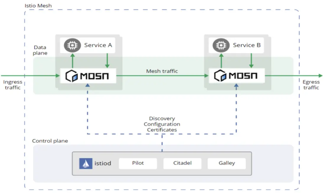 經過 MOSN 社區近幾個月的不斷努力,MOSN 已經成功適配 Istio。7 月 28 日 Istio 官方發表了本人署名的文章《Istio 數據平面的另一個選擇 —— MOSN》,説明 MOSN 是可以作為數據面被選擇使用的,感興趣可以點擊查看 https://istio.io/latest/blog/...。在 Service Mesh 領域,使用Istio 作為控制平面已成為主流,如下圖所示可以看出在 Istio 的架構中,我們是將 MOSN 作為 Istio 的數據面,通過藉助 Istio 實現服務治理。