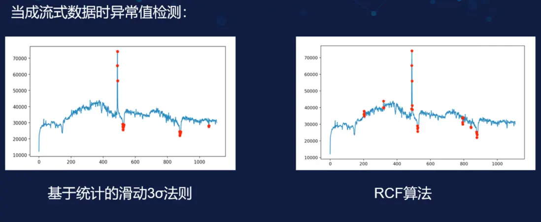 在檢測實時數據時,基於統計的方法可以使用滑動窗方式來檢測,讓窗去滑動更新,而我們只需要統計窗的情況就好。使用這種方式後 3σ 法則就可以將絕大部分的突變點都檢測出來了,當然很明顯的可以看到右圖中使用 RCF(隨機剪切森林算法能夠檢測到的突變點更多,不過現在這張圖我沒有放大,但是 RCF 其實將局部的小異常也檢測出來了。