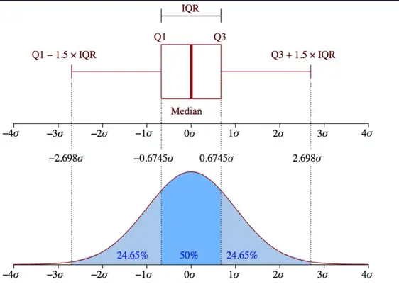 上圖是兩種統計方式的對應關係。假設數據分佈是一個純粹的正態分佈,我們可以看到箱體圖對應的 σ 值只有 2.7σ 左右,不到 3σ 。當然很多時候我們並不知道它的具體分佈是什麼,需要根據樣本的方差、標準差來求 σ,如果你實在不知道是什麼分佈,可以將它假設為是一個正態分佈。因為正態分佈是自然界一個比較“和諧“的分佈,一般場景中就算有偏差也不會過於離譜。