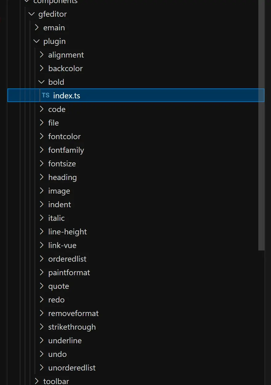 如圖1在components下的gfeditor就是編輯器代碼包,其中emain是編輯器主體代碼、plugin是插件代碼(擴展插件可放在這裏)、toolbar是編輯器的工具工具欄(圖2)。