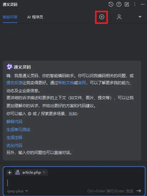 • **創建新會話:**在智能問答的右上角有一個圓形 ​​+​​ 號按鈕,點擊即可創建新對話。