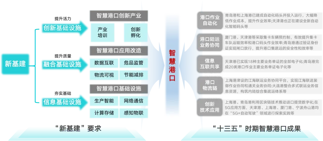 基於十四五對“新基建”的要求,結合我國港口發展的階段性特點,目前智慧港口建設可分為三大方向。一方面是以5G通訊、物聯網等新一代信息技術與港口服務深度融合,大力發展智能港口基礎設施,生產智能自動,做強智慧港口的“信息基礎設施”;另一方面是通過區塊鏈、數據分析等技術應用,實現港口要素自我感知、廣泛互聯,港口運營決策客觀智慧,客户服務敏捷高效,搭建智慧港口“服務平台”,做優智慧港口的“融合基礎設施”;第三方面是基於港口各種資源、技術、服務、管理深度融合,實現開放共享、系統高效、綠色環保、可持續發展的現代化港口形態,做新智慧港口的“創新基礎設施”。