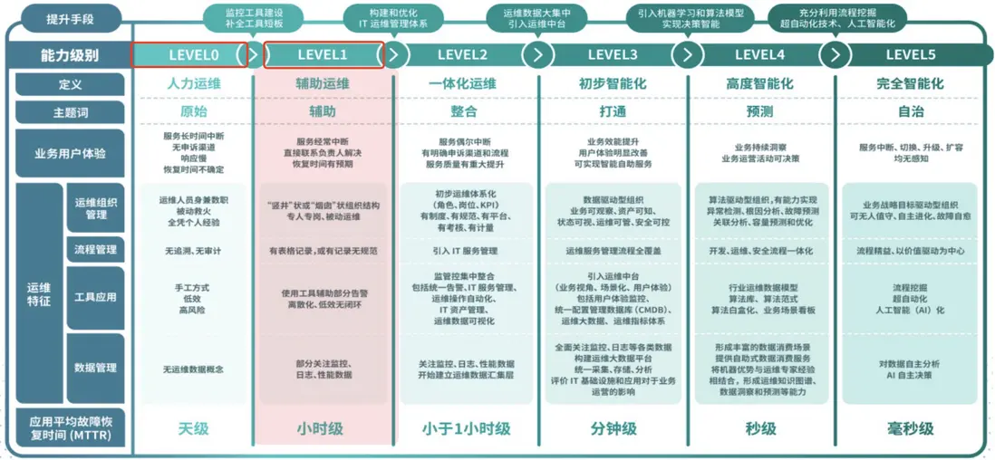 與此同時,為充分發揮IT服務管理的效能,雲智慧將智能運維演進路線從Level 0到Level 5分為6個階段,即人力運維、輔助運維、一體化運維、初步智能化運維、高度智能化運維以及完全智能化運維。目前港口行業運維則基本處於LEVEL0-LEVEL1之前,具體如下圖所示: