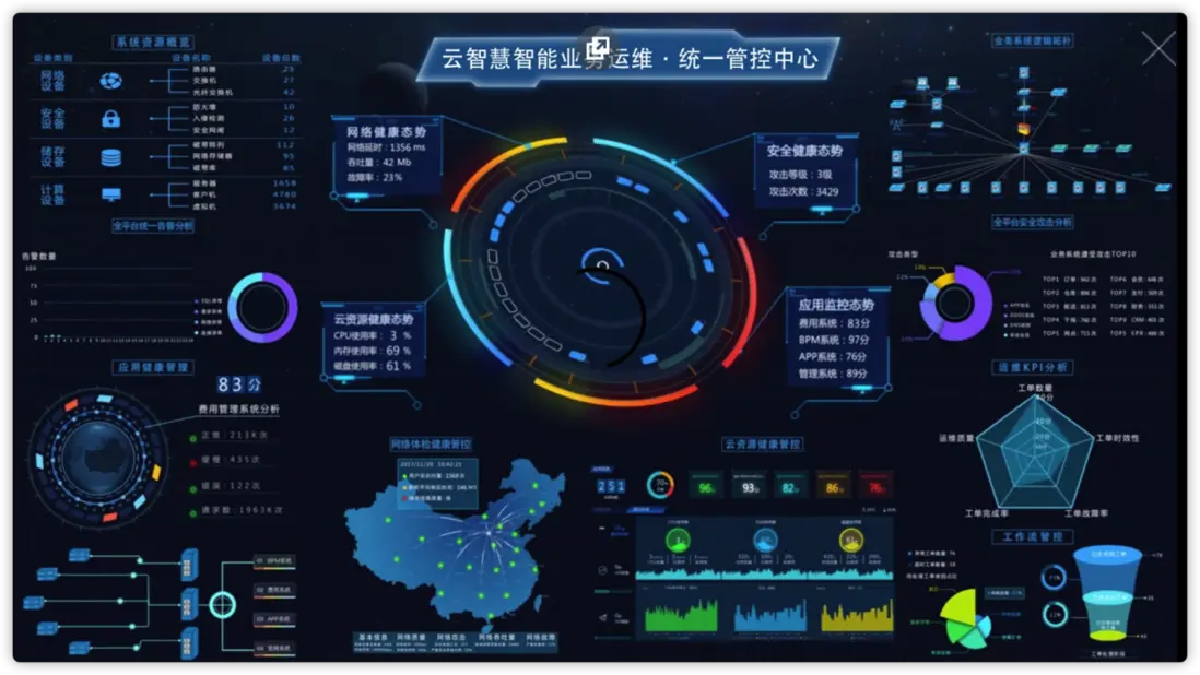 下圖為雲智慧全棧式監控場景,它能夠對IDC基礎設施到上層業務的全方位監控:包括面向機房動力環境設施、服務器硬件、操作系統、網絡、應用、業務等運行健康度狀態以及性能狀況進行實時監控與管理。
