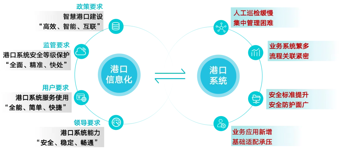 現如今,隨着港口信息化的快速發展,港口行業IT運維保障工作同時也面臨着來自政策、監管、用户體驗、上級領導等方面的標準升級,從而導致運維保障工作的挑戰加大。具體包含以下幾方面: