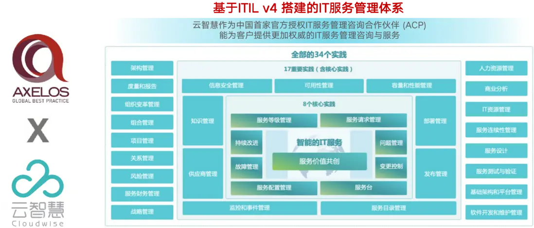 企業要實現運維問題快速、有效的處置修復,必然需要基於科學化的IT服務管理體系。雲智慧是通過AXELOS(ITIL版權所有方)認證的中國首家官方授權的IT服務管理諮詢合作伙伴 (ACP)。這意味着行業內,雲智慧將能為有意願引入ITIL的企業提供更加權威的IT服務管理諮詢與服務,並進一步加強該理論的本地化實踐。值得一提的是,雲智慧現有產品框架也是遵循新一代ITIL理念打造的。