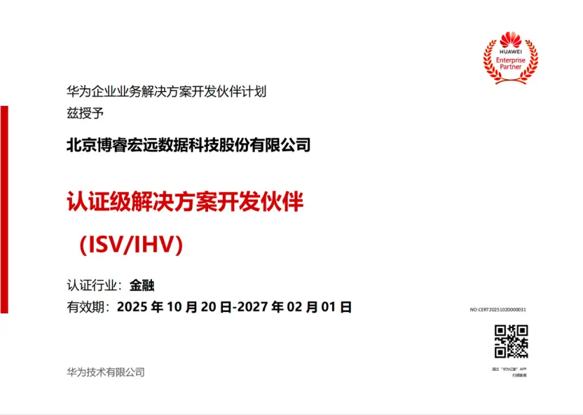 成為華為認證級解決方案開發夥伴,意味着博睿數據在技術實力、解決方案成熟度及與華為產品兼容性方面獲得華為官方權威認可。這一認證如同打開全球市場的“通行證”,為雙方進一步拓展海外業務提供了強有力的合規與技術背書。