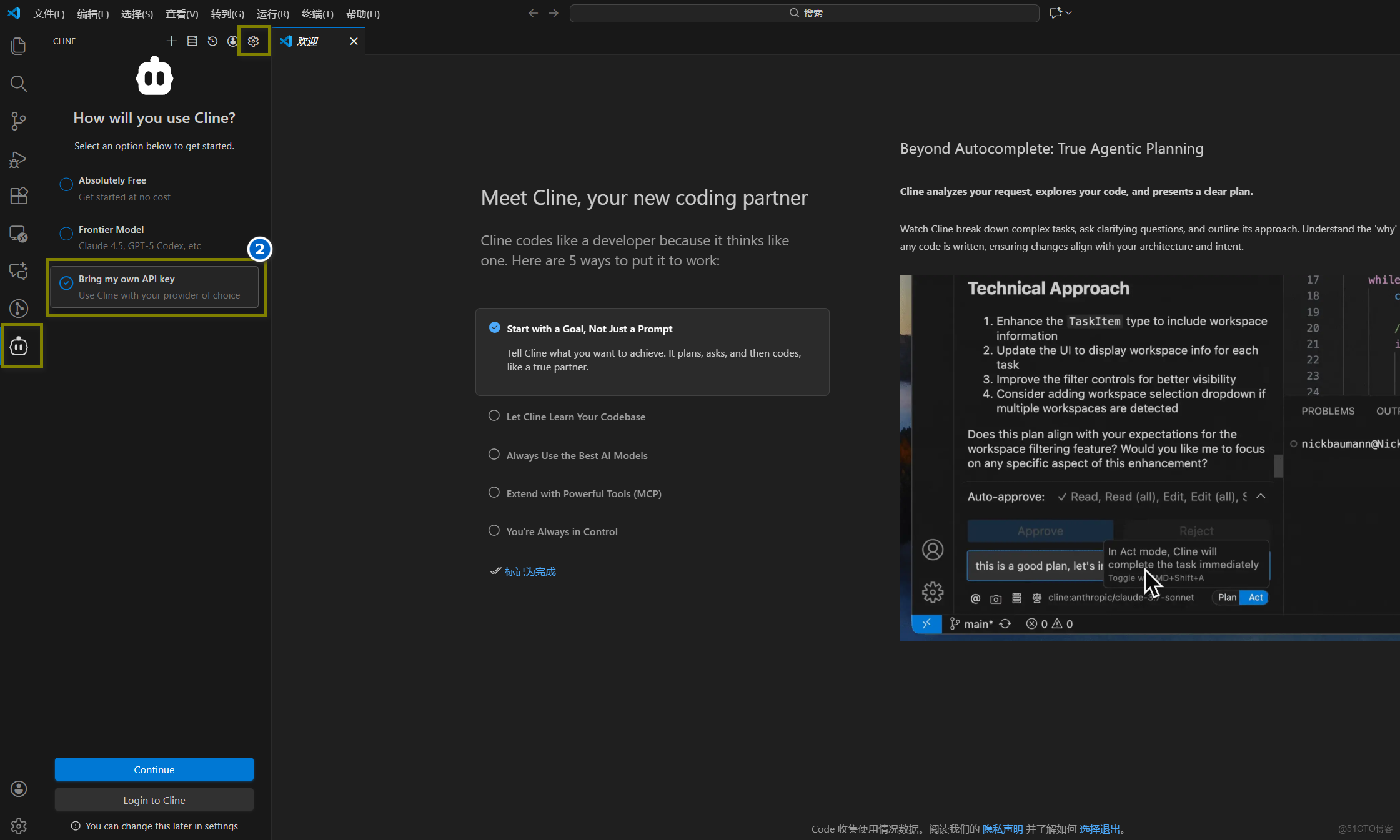 第一次使用會默認進入Cline的配置界面,也可以通過點擊Cline圖標後點擊Cline界面右上角設置按鈕進入配置界面,我們在Cline的配置界面選擇第三個bring my own API key(下圖中②的位置),然後點擊continue進入配置界面。