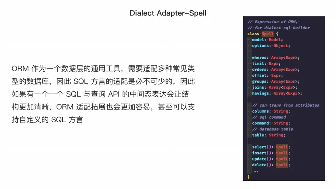 - Dialect Adopter 是核心功能,將 model 的 API 調用轉換成對應的 SQL,並在轉換過程中抹平 ORM 會適配的不同數據庫之間的方言差異。