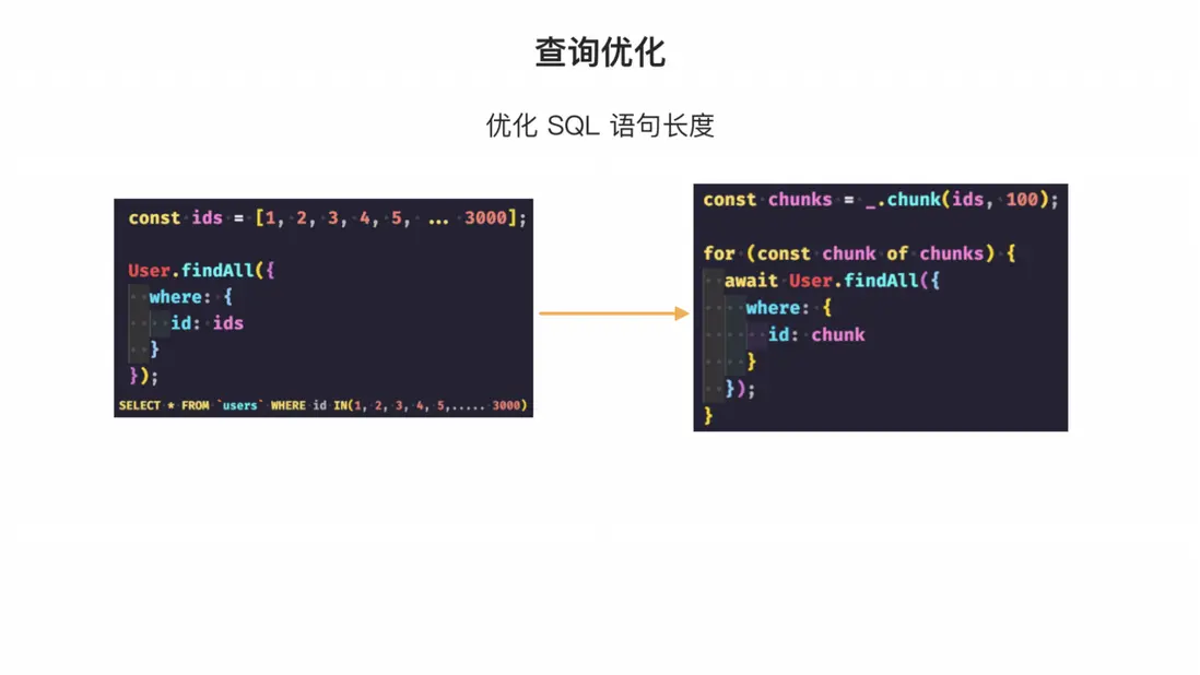 此外,在使用 ORM 工具時,需要進行查詢優化,因為 ORM 只能根據輸入參數做一些簡單的優化處理,而對於一些極限情況,需要開發人員自己去注意。例如,在進行 SQL 查詢用 in 時,由於條件長度較長,可能會因為數據庫引擎的原因導致 SQL 無法執行或執行效率較低,此時需要將查詢條件進行分組,利用 Node.js 進行分批查詢,並在內存中組裝結果。
