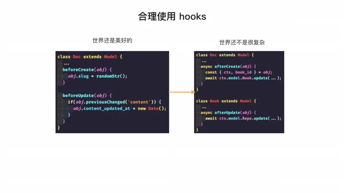 - Hooks 需要有一個原函數,它的入參和返回值類型不能被修改。Hooks 的實現方式有很多種,其中比較直觀的一種方式是面向切面編程。在 ORM 的 API 中,一些 API 可以配置或需要配置 hooks,例如 create、update、destroy 等。