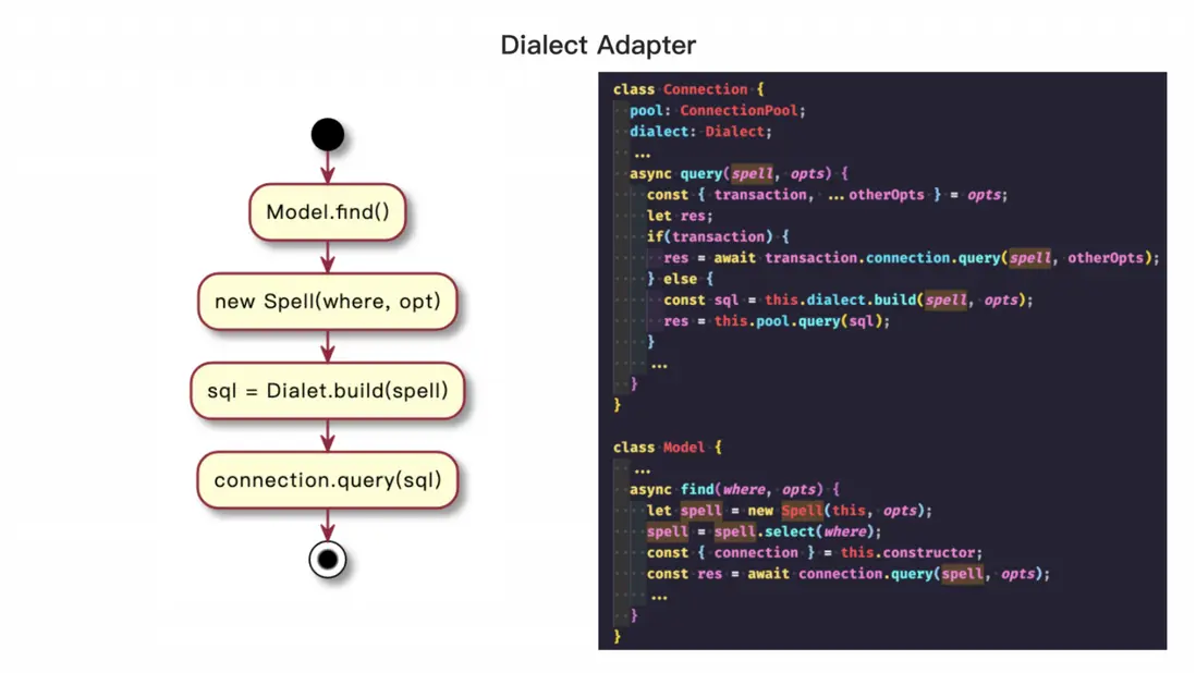 整個查詢的執行過程是這樣的:假設我們使用 user model 去查詢某個用户數據,我們在 user model 中使用 find 方法並根據傳參生成對應的 Spell 對象。然後我們在 Connection 類中管理數據庫連接池和方言(即 Dialect),實現一個 query 方法,在其中調用 Dialect 生成 SQL,使用 SQL Driver 執行 SQL,最後通過進行數據轉換並返回結果。