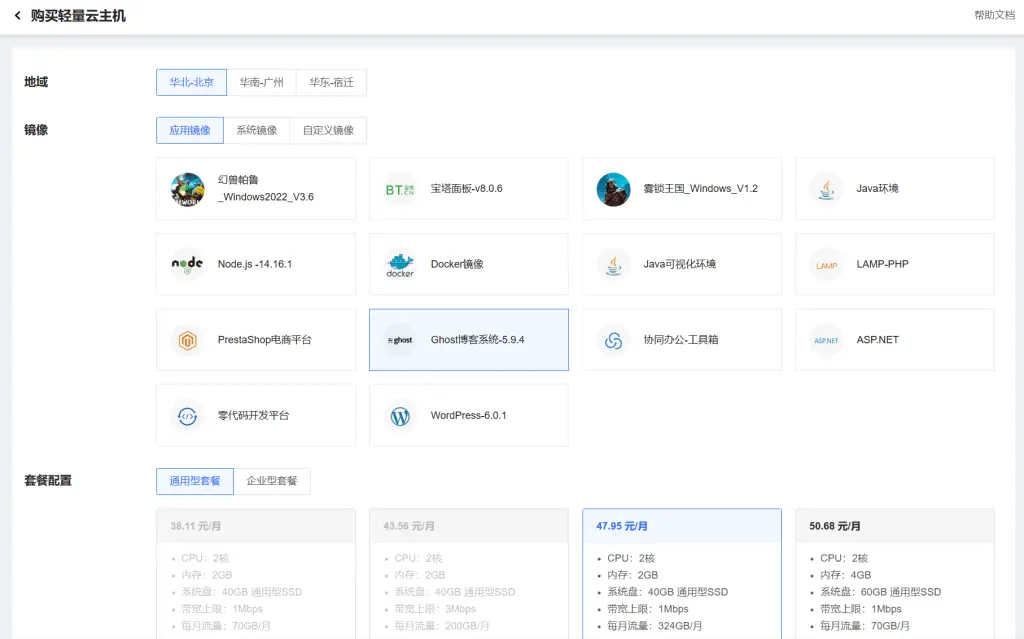 沒有的的可以點擊查看:雲服務器優惠合集。選擇Ghost鏡像,以及套餐版本、時長等內容,進行下單創建輕量雲主機實例。