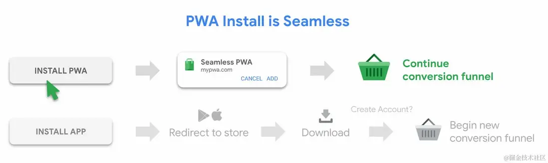 為什麼你希望用户安裝你的PWA應用?為了讓他們更容易回到你的站點。一個安卓App的安裝大致有三個步驟:先去應用市場搜索App,下載,安裝App。一個PWA的App的安裝就很簡單,直接點擊一個按鈕即可,用户無需離開當前會話。